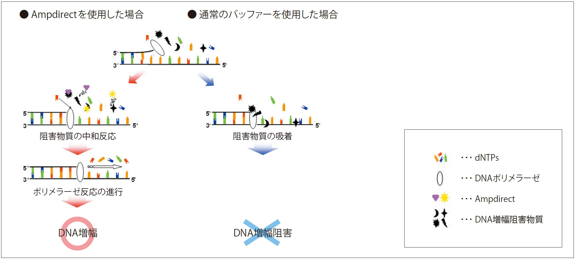 Ampdirect(PCRバッファー)には、サンプル中に含まれるPCR阻害物質の影響を抑制する働きがあり、血液からの直接 PCR や粗精製 DNA サンプルからの安定した PCR を可能としました。